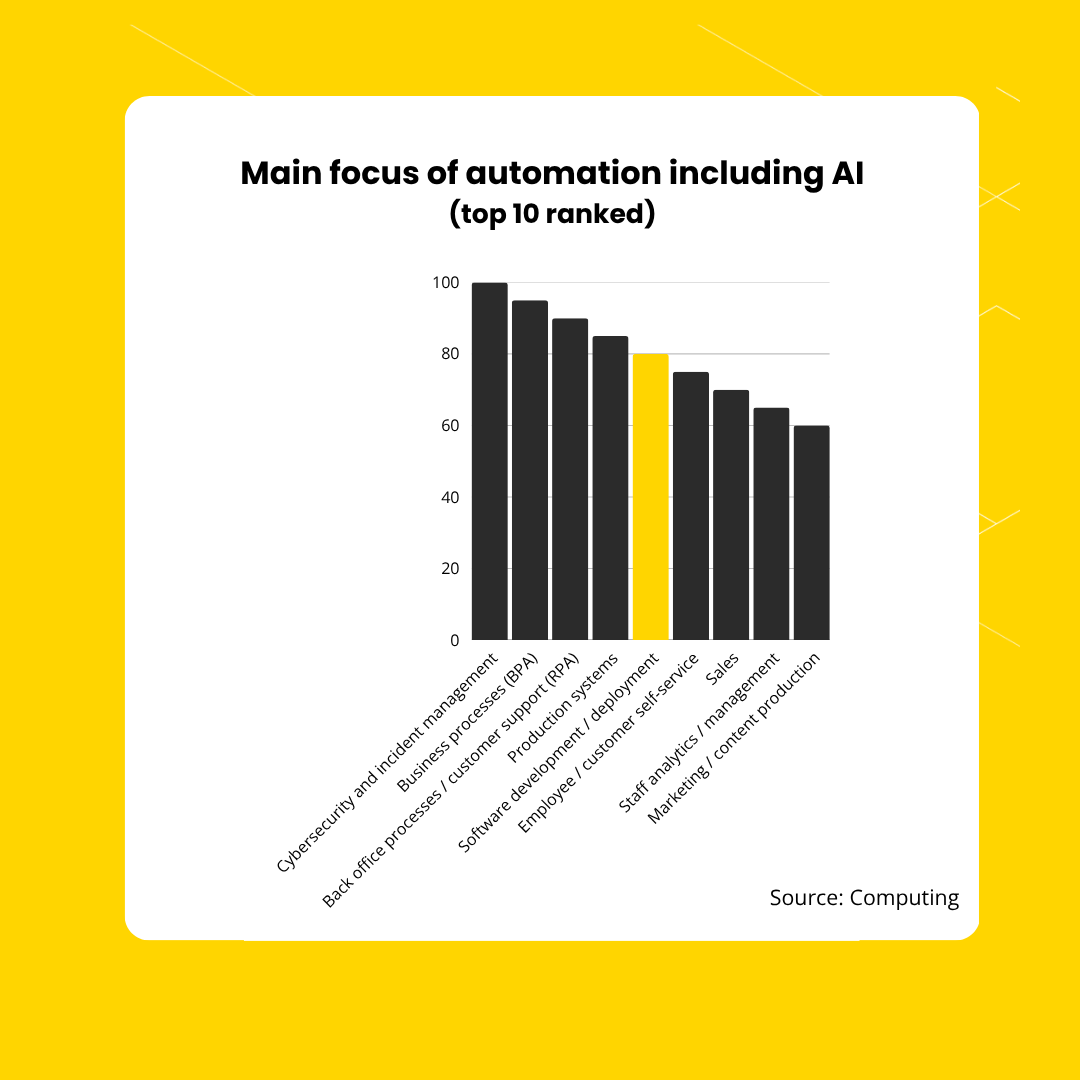 Software development and deployment rank among the top five areas of focus for automation, including AI, according to recent research by Computing Magazine surveying 100 UK IT leaders.
